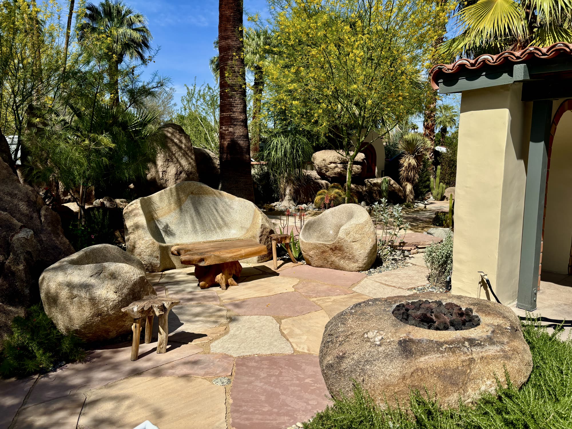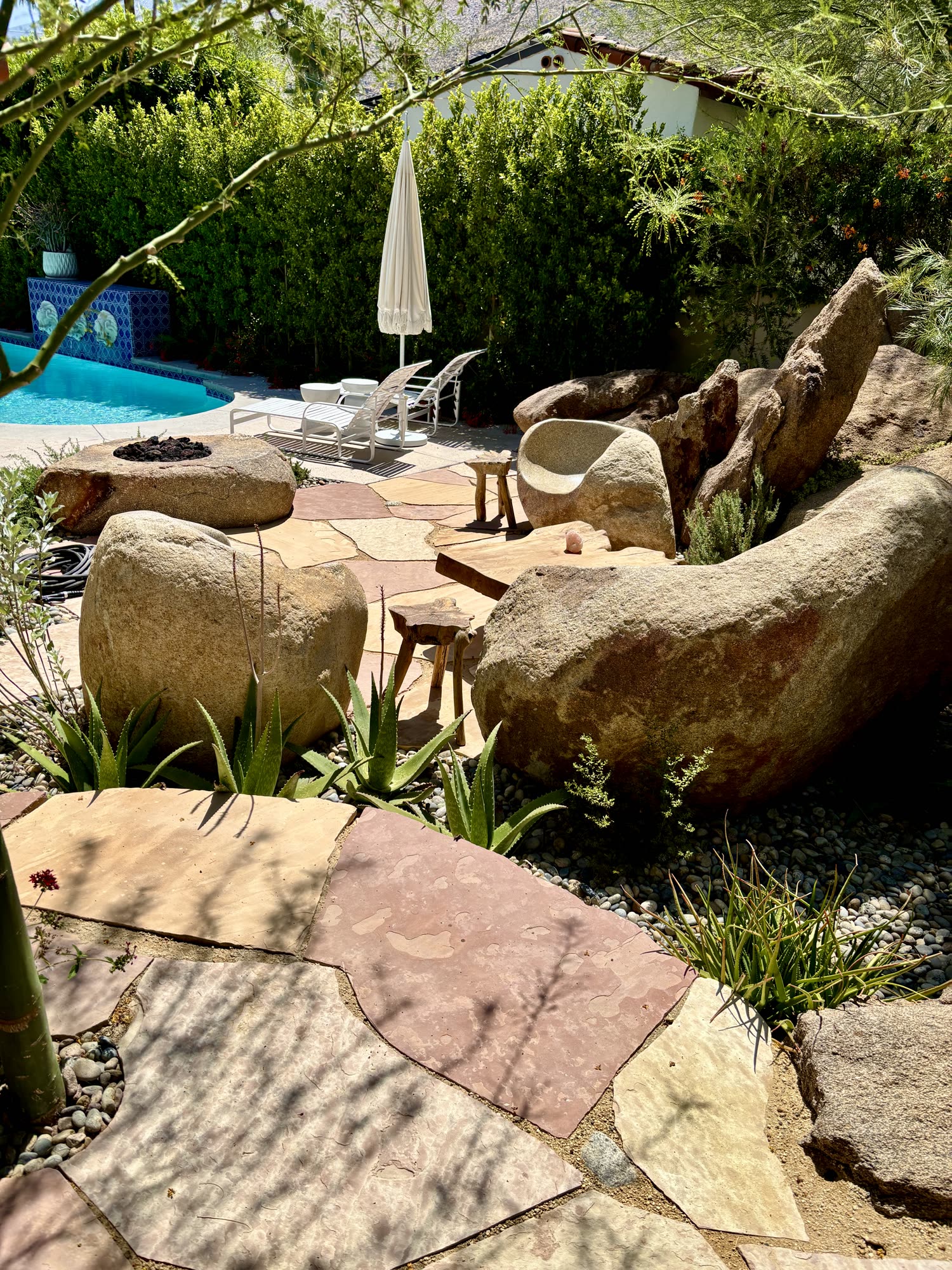 Naturalistic boulder placement, Rock furniture and stone fire pit.